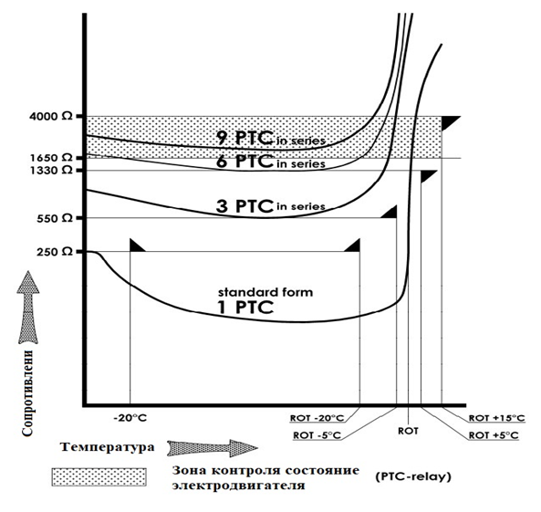 Сопротивление PTC-термистора остаётся относительно низким до определённой температуры (точки Кюри). Как только температура превышает этот порог, сопротивление резко возрастает. Это ограничивает ток, проходящий через термистор, и действует как саморегулирующийся элемент. Ниже точки Кюри сопротивление остаётся стабильным и низким, обеспечивая нормальный ток. Обычно применяются для защиты обмоток мощных моторов и трансформаторов. Для защиты трёхфазных моторов требуется несколько PTC-термисторов, соединённых последовательно. При превышении температуры мотора значения, соответствующего номинальной рабочей температуре (ROT), активируется реле и происходит отключение питания. Номинальная рабочая температура (ROT) таких термисторов обычно находится в диапазоне от +60 °C до +180 °C и увеличивается с шагом 10 °C.