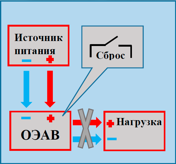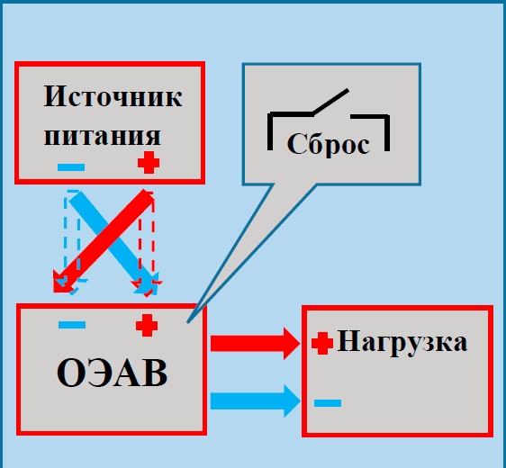При смене полярности на входе ОЭАВ происходит шунтирование источника питания и напряжение не проходит до потребителя.