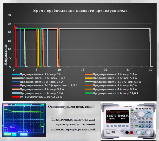 Ток предохранителяТок нагрузкиВремя срабатывания плавкого предохранителяВремя срабатывания эл. выключателя