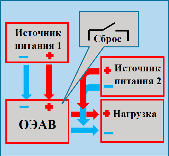 При обратном токе происходит шунтирование выхода ОЭАВ, что вызывает срабатывание защиты резервного источника питания. В случае если резервный источник питания не оборудован средствами собственной защиты, необходимо установить второй модуль ОЭАВ в разрыв цепи резервного источника и потребителя.